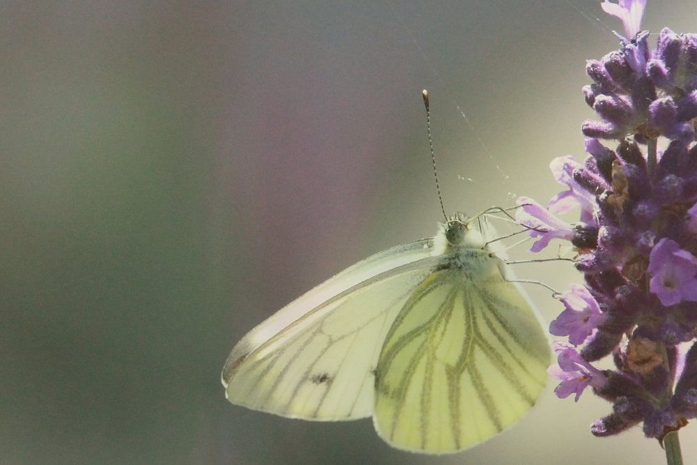 Een gecombineerd beeld van vrolijke en vervaagde bloemen met een vlinder 'koolwitje' die net geland is op een bloeiende lavendel badend in het zonlicht. Dit beeld is passend in elke kamer en staat goed op een dieppaarse muur, oudroze muur of een sneeuwwitte muur.