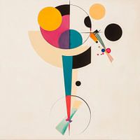 Een harmonieus samenspel van felle kleuren en geometrische vormen verrijst op de heldere achtergrond. Dynamische lijnen en vrolijke cirkels trekken de kijker mee in een spannend visueel spel dat zowel evenwicht als beweging uitstraalt. Deze compositie straalt een levendige energie uit die aanzet tot nadenken.