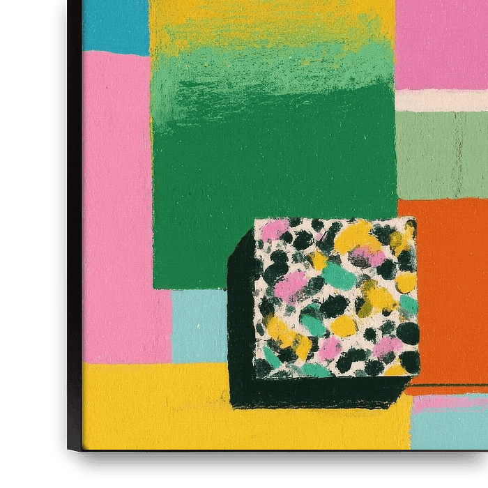 Dit abstracte schilderij toont geometrische vormen in heldere kleuren op een blauwe achtergrond. Linksboven troont een oranje cirkel met daaronder gele, roze, groene, paarse en lichtblauwe rechthoeken die elkaar deels overlappen. In het midden is een zwart vierkant met een kleurrijk patroon van roze, wit, blauw en zwart. De compositie…