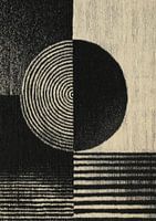 Een fascinerende zwart-witcompositie die geometrische vormen en patronen combineert. Een centraal element toont de helft van een cirkel met concentrische lijnen, terwijl de andere helft een donker gevulde halve cirkel is. De achtergrond is verdeeld in vier kwadranten, waarbij texturen zoals fijne verticale lijnen, donkere korrels en…