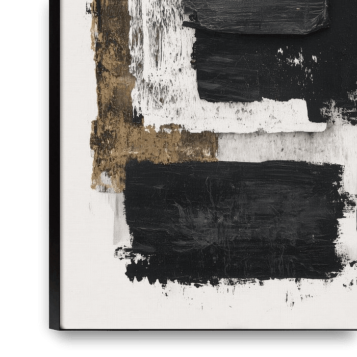 Gedurfde abstracte compositie met gelaagde zwarte en antracietkleurige blokken met gestructureerde penseelstreken, geaccentueerd door gouden en witte geometrische vormen op een crèmekleurige achtergrond. Mixed media-esthetiek met zichtbare verftextuur.