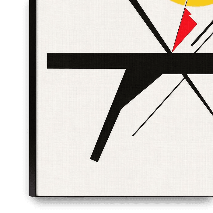 Geometrische vormen dansen in een dynamische compositie van krachtige kleuren: Felrood en stralend geel dansen met koel blauw als ze zich groeperen rond een opvallende zwarte basis. De scherpe lijnen en stippen creëren een gevoel van beweging en spanning, alsof de elementen op het punt staan te exploderen in een nieuwe richting.