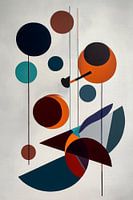 Zwevende vormen dansen in harmonie - grote, gedurfde cirkels smelten samen met zachte, gebogen lijnen. Een samenspel van warme aardetinten en koele kleuren creëert een harmonieuze compositie die zowel rust als beweging uitstraalt. De verticale structuren geven het beeld een moderne elegantie die de kijker boeit en uitnodigt om te blijven hangen.