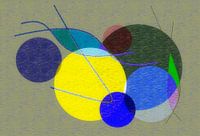Een kleurrijk, modern abstract met cirkels tegen een grijze achtergrond. Een citroengele cirkel zit tussen 3 blauwe en 1 groene cirkel.