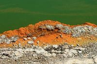Nieuw-Zeeland, en dan met name het noordereiland, staat bekend om geothermische activiteit. Dit is goed te zien in het park Wai-o-tapu. Er is een geyser en er zijn verschillende geothermale wateren, met de meest felle kleuren. Het contrast tussen het groen, het oranje en het wit kan haast niet scherper.