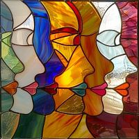 Abstracte gezichten, kleurrijk, van opzij gezien, glas in lood stijl.