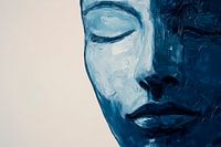 Een zachte, kalme uitdrukking wordt gecombineerd met een diep, melancholisch blauw en wit palet. De gesloten ogen stralen een meditatieve sereniteit uit die de kijker uitnodigt om even stil te staan en na te denken. Dit kunstwerk is perfect voor de slaapkamer, waar het een rustgevende en ontspannen sfeer creëert.