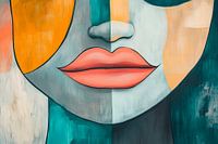 In levendige kleuren en creatieve vormen springen de grote, expressieve lippen en gestileerde gelaatstrekken meteen in het oog. De harmonieuze combinatie van gedurfd oranje en zachte blauw- en grijstinten geeft de kamer een modern tintje. Ideaal voor in de woonkamer om gesprekken te stimuleren en een inspirerende sfeer te creëren.