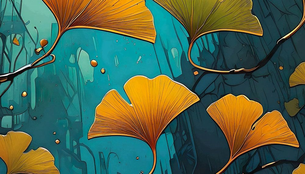 Vergeelde ginkgo biloba bladeren tegen een abstracte blauwe achtergrond. Gegenereerd met behulp van AI.