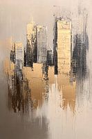 Dit moderne kunstwerk toont een abstracte weergave van een stedelijke skyline, met elegante gouden accenten en subtiele grijstinten die het geheel een verfijnde uitstraling geven. Perfect als statement piece in een eigentijds interieur, voegt dit schilderij een vleugje luxe en stedelijke dynamiek toe aan elke ruimte. Door de contrasterende kleuren en het gebruik van textuur trekt het meteen de aandacht en geeft het een moderne, minimalistische sfeer. Ideaal voor kantoorruimtes, slaapkamers of als blikvanger in een woonkamer. De combinatie van goud en neutrale tinten zorgt ervoor dat het gemakkelijk te integreren is in diverse interieurstijlen.