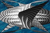 Dit kunstwerk heeft als basis twee foto's. Twee foto's die ik met mijn camera heb gemaakt door middel van meervoudige belichting. Deze foto's zijn gemaakt van twee gewone gebruiksvoorwerpen. Door hiervan foto's te maken en deze samen te voegen ontstond een mooi grafisch ruitpatroon met golvende lijnen. Deze zwart wit foto heb ik digitaal vervormd. Tijdens dit creatieve proces ontstonden er vormen die lijken op vissen. Maar het zijn geen gewone vissen, ze missen in dit kunstwerk een kop en een staart. Maar ze hebben wel een lijf en vinnen. En ze hebben schubben met een grafisch ruitpatroon. En zijn ze samen verweven of zwemmen ze heel dicht tegen elkaar aan?