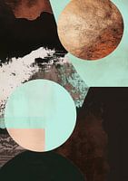 Dit abstracte kunstwerk combineert turquoise, bruin en zwart met glinsterende koperen metallic cirkels. Een korrelige overlay voegt diepte toe aan de gedempte tinten. Het minimalistische ontwerp met zachte randen en eenvoudige vormen heeft een harmonieus kleurenpalet en een moderne esthetiek. De elementen zijn gerealiseerd in een…