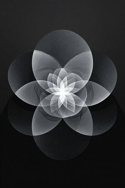Een abstracte, symmetrische compositie van over elkaar liggende, halfdoorzichtige cirkelvormen vormt een bloemachtige structuur tegen een diepzwarte achtergrond. De fijne korrel en zachte overgangen creëren een bijna zwevende lichtheid, terwijl de exacte geometrie rust en orde uitstraalt. Het centrum lijkt een energetische kern waaruit…