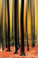 Prachtige abstracte opname met verticale blur van de bomen in het Speulderbos met gele en oranje bladeren in de herfst