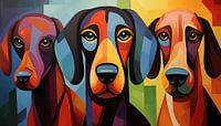 Abstracte honden kubisme kleurrijk panorama schilderij is een expressief en modern kunstwerk dat de levendige energie van 3 honden vangt in een dynamische kubistische stijl. In dit schilderij komen vorm, kleur en emotie samen in een explosie van creativiteit. De honden worden vertaald naar abstracte vormen en vlakken die elkaar overlappen en samen een harmonieus geheel vormen. Deze kunstzinnige interpretatie geeft het werk diepte, beweging en een verrassende visuele spanning die blijft boeien.