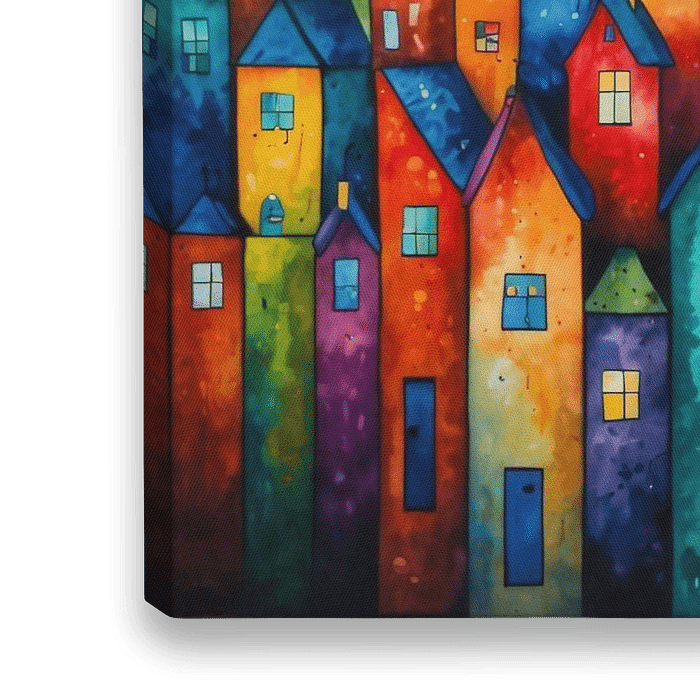 Dit is een digitaal kunstwerk van een verzameling abstracte kleurrijke huizen. Een vrolijk en kleurrijk schilderij geschikt voor elke ruimte.