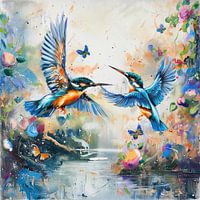 De compositie straalt een gevoel van vrijheid en spontaniteit uit, en de rijke, levendige kleuren roepen een gevoel van vreugde en bewondering op voor de natuur. Dit schilderij is een viering van de schoonheid en vitaliteit van ijsvogels, gevangen in een abstracte en expressieve stijl die de verbeelding prikkelt en de zintuigen aanspreekt.