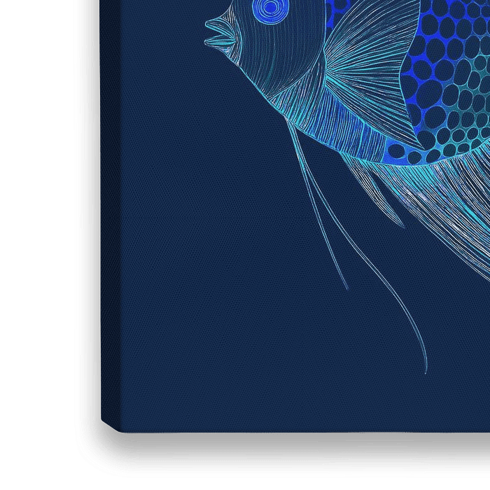 Dit moderne kunstwerk toont een abstracte en sierlijke vis uitgevoerd in prachtige lichtblauwe lijnen tegen een diepblauwe achtergrond. De gedetailleerde schubben en de etherische vinnen creëren een dromerig en mysterieus effect, waardoor het een opvallende toevoeging is aan elk interieur.