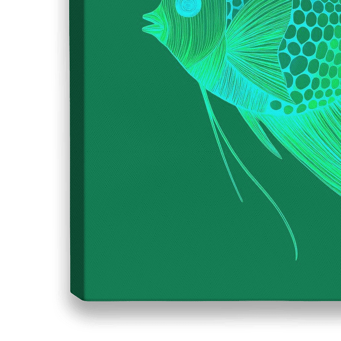 Dit moderne kunstwerk toont een abstracte en sierlijke vis uitgevoerd in frisse groene lijnen tegen een diepgroene achtergrond. De gedetailleerde schubben en de etherische vinnen creëren een dromerig en mysterieus effect, waardoor het een opvallende toevoeging is aan elk interieur.