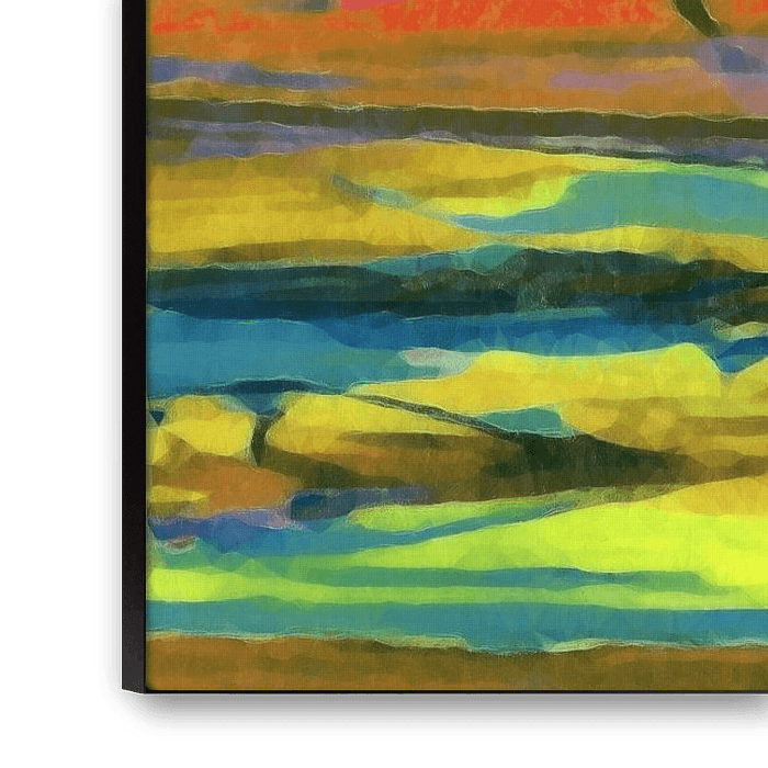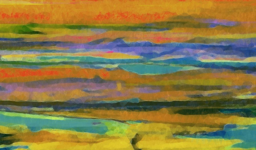 Abstracte impressie lichtval ondergaande zon is digitaal gemaakt. Format: liggend. Stijl: abstracte impressionisme in tinten geel, oranje, rood en blauw.