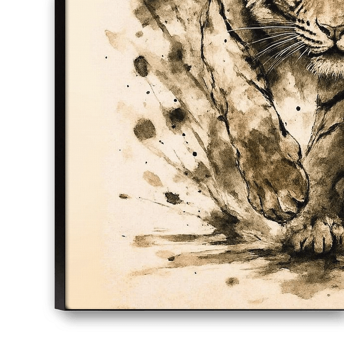 Abstract inktschilderij van een tijger in beweging, die met een intense blik voorwaarts loopt. Dynamische penseelstreken en gespatte inkt creëren een energiek en artistiek effect, waarbij het realisme van de strepen van de tijger vermengd wordt met expressieve abstracte texturen. De achtergrond is minimaal en lichtbeige, waardoor de krachtige streken en spatten rond de tijger worden benadrukt. Sterk gevoel van beweging met de staart van de tijger die een zwierige boog vormt, Japanse sumi-e stijl, gedetailleerd maar vloeiend, artistieke en krachtige compositie, inktspatten en aquareleffecten