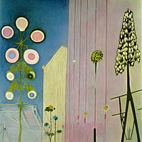 Een tafereel toont pastelkleurige kassen, hun zachte tinten contrasterend met het omringende landschap. Buiten en binnen groeien vreemde bloemen op lange, stelen. De combinatie van de subtiele kleuren en excentrieke flora creëert een betoverende en mysterieuze sfeer. De kijker wordt uitgenodigd om deze wonderlijke tuinen te verkennen, waar de grens tussen werkelijkheid en verbeelding vervaagt.