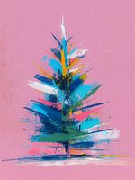 Dit kunstwerk toont een moderne en speelse interpretatie van de kerstboom. Op een opvallende roze achtergrond staat een boom opgebouwd uit expressieve penseelstreken in levendige kleuren zoals blauw, groen, geel en wit. De dynamische verfvegen geven de boom een energieke en eigentijdse uitstraling, terwijl de heldere contrasten een feestelijke sfeer oproepen. Ondanks de minimalistische vormgeving is de boom direct herkenbaar, en de abstracte stijl geeft het geheel een artistieke twist. De kleuren lijken bijna te dansen over het doek, wat zorgt voor een vrolijke en optimistische uitstraling. Dit werk vangt de essentie van de feestdagen, maar dan in een verrassend modern en kleurrijk jasje.