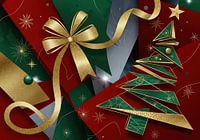 Digitale afbeelding met abstracte geometrische kerstelementen: een gestileerde boom, een grote gouden strik en decoratieve sneeuwvlokken op een rode en groene achtergrond.