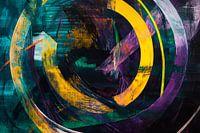Een visuele symfonie van levendig geel en diep paars, afgewisseld met verfrissend groen, ontvouwt zich te midden van dynamische wervelingen van kleur. Deze energieke compositie straalt creativiteit en levensvreugde uit, ideaal voor een moderne woonkamer waar het gesprekken stimuleert en inspirerende momenten aanmoedigt.