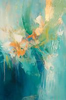 Zachte tinten turquoise en zacht geel smelten samen in een harmonieuze dans die doet denken aan een lentemorgen. Lichte penseelstreken en vloeiende vormen hebben een kalmerend en uitnodigend effect. Dit kunstwerk is ideaal voor de woonkamer, waar het een ontspannen, creatieve sfeer creëert en gesprekken stimuleert.