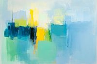 Een zachte golf van koele blauwe en groene tinten transformeert de kamer in een oase van rust. Gele accenten stralen warmte uit en geven het geheel een speelse energie. Ideaal voor de woonkamer, het creëert een harmonieuze sfeer die uitnodigt om te blijven hangen en te ontspannen.