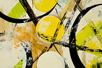 Er ontvouwt zich een levendig samenspel van cirkelvormige elementen, gehuld in levendige gelen en een vleugje smaakvolle aardetinten. De dynamische lijnen en contrasten geven het werk een pulserende energie, terwijl harmonieuze structuren samenkomen en het oog uitnodigen tot eindeloos onderzoek. De compositie straalt een fascinerend…