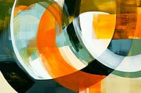 Een dynamische compositie van zachte, gebogen vormen en levendige kleuren zoals oranje en groen springt in het oog en brengt de kamer tot leven. Deze moderne kunst brengt een frisse energie in de woonkamer en nodigt uit tot creatieve expressie en ontspannen gesprekken. Het harmonieuze samenspel van kleuren inspireert en geeft de kamer een positieve sfeer.