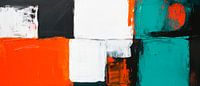 Een harmonieus samenspel van krachtige kleuren trekt onmiddellijk de aandacht. Levendig oranje ontmoet koel groenblauw en gedurfd zwart, terwijl helder witte oppervlakken voor contrast zorgen. Dit levendige kunstwerk brengt frisse energie in elke woonkamer en creëert een inspirerende sfeer om te ontspannen en te vertoeven.
