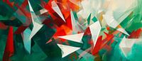 Heldere kleuren in fascinerende vormen creëren een dynamische energie die de kamer verlevendigt. Scherpe, sneeuwwitte elementen steken af tegen een achtergrond van harmonieus groen en warm rood. Dit levendige kunstwerk is perfect voor een creatieve keuken of inspirerende studeerkamer om motivatie en vitaliteit te stimuleren.