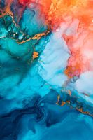 Een fascinerend samenspel van levendige kleuren geeft dit kunstwerk een dynamische energie. De zachte blauwe en turquoise tinten harmoniëren perfect met sterke oranje en gouden nuances, die doen denken aan een zonsondergang boven de oceaan. Ideaal in de woonkamer om een ontspannen sfeer te creëren en de aandacht van je gasten te trekken.