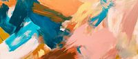 Er ontvouwt zich een levendig kleurenspel van zachtroze en warme oranje tinten gecombineerd met levendig blauw. Deze dynamische penseelstreken geven energie en zijn inspirerend, perfect voor een creatieve werkkamer of een moderne woonkamer. De harmonieuze compositie nodigt uit tot dromen en creëren en geeft elke kamer een frisse touch.
