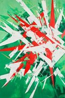 Creatieve energie ontvouwt zich in een explosief samenspel van scherpe rode en witte lijnen die dynamisch vibreren tegen een kalmerend groen. Deze compositie werkt als een pulserend hart van de kamer en creëert een levendige sfeer in een moderne woonkamer die gesprekken en creatieve gedachten stimuleert. Een echt hoogtepunt voor elke…