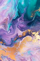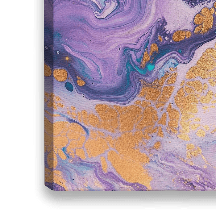 In een magisch samenspel van violet, turkoois en fonkelend goud ontvouwt zich een fascinerende kleurenzee, afgewisseld met levendige stromen. Deze dynamische compositie brengt elegantie en creativiteit in de woonkamer en creëert een ontspannen sfeer die de kijker onmiddellijk betovert.