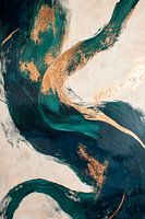 Dynamische, gouden lijnen meanderen over een zacht, lichtgekleurd oppervlak in spannende groentinten. Deze abstracte compositie straalt moderne elegantie uit en nodigt uit om te blijven hangen. Perfect om een artistiek tintje aan een woonkamer te geven en een sfeer van inspiratie te creëren.