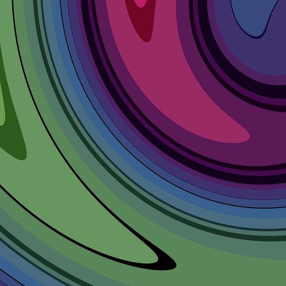 Enigszins aan popart herinnerend, zijn kleurbanen in een deel van het kleurenspectrum van de regenboog - van oranje tot groen en blauw tot violet en zwart - in een gedeeltelijk getoonde spiraal gedraaid, wat resulteert in een dynamisch abstract beeld.