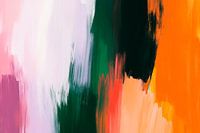 Een dynamisch kleurenspel dat de zintuigen prikkelt met levendige penseelstreken! Warme oranje en weelderige groene tinten vermengen zich met zachtroze en witte nuances om een vrolijke energie aan elke kamer toe te voegen. Dit kunstwerk is perfect voor de woonkamer, waar het aanzet tot vrolijke gesprekken en creatieve inspiratie.