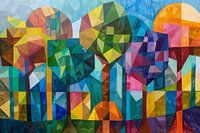 Koop dit abstracte kunstwerk Abstracte kleurrijke bomen in geometrische stad van Art & Soul Creations op canvas, aluminium dibond, (ingelijste) fotoprint, behang en ArtFrame, op maat geprint in Fine-Art kwaliteit.