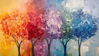 Abstracte kleurrijke bomen panorama schilderij in felle kleuren dat elke ruimte een luxe uitstraling geeft. Het unieke en stijlvolle ontwerp maakt het een echte aandachtstrekker. De prachtige kleuren en het bijzondere ontwerp maken dit kunstwerk 100% origineel. Het is de ideale fotoprint om je interieur helemaal af te maken.