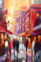 Dit levendige ontwerp vangt de essentie van een drukke stadsstraat in een dynamisch abstracte stijl. De felle kleuren en expressieve penseelstreken brengen beweging en energie over, waardoor je het gevoel krijgt dat je midden in de actie staat. De gebouwen zijn weergegeven in gedurfde tinten van rood, oranje en paars, terwijl silhouetten van mensen door de straten wandelen, wat de hectische maar levendige sfeer van de stad versterkt. Dit kunstwerk zal een moderne, energieke uitstraling geven aan elke ruimte, vooral in kamers waar een vleugje kleur en dynamiek welkom is. Perfect voor liefhebbers van moderne kunst die houden van expressieve en abstracte stadsgezichten.