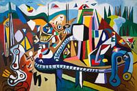 Dit kunstwerk is een dynamische explosie van kleuren en vormen, die de aandacht trekt met zijn expressieve stijl en intrigerende abstracte elementen. Het schilderij bestaat uit een mix van geometrische en organische vormen, die over het doek heen lijken te dansen in een ritmisch samenspel van lijnen en patronen. De felle kleuren - met prominente tinten blauw, rood, geel en groen - creëren een levendige energie die ideaal is voor moderne interieurs. Dit werk past perfect in een creatieve omgeving zoals een kantoor, waar het de ruimte kan verlevendigen en inspireren. Het is ook geschikt voor woonkamers waar het als opvallend statement piece fungeert. Dit kunstwerk nodigt uit tot interpretatie en biedt steeds iets nieuws om te ontdekken.