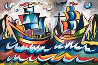 Abstracte kleurrijke zeilschepen op zee van Art & Soul Creations