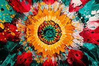 Dit ontwerp straalt energie en levendigheid uit met een explosie van kleuren die samen een abstracte interpretatie van een zonnebloem vormen. De centrale bloem is omringd door dynamische penseelstreken en spatten die een gevoel van beweging en creativiteit oproepen. Perfect voor wie een opvallend en inspirerend kunstwerk wil toevoegen aan een moderne ruimte. Dit stuk brengt kleur en karakter in elke woonkamer of eetkamer, en zorgt voor een gespreksonderwerp dat indruk maakt.