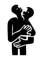 Een abstracte illustratie in zwart-wit van een menselijke knuffel. Deze illustratie is er een uit een serie van twee.