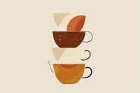 Deze stijlvolle illustratie toont een creatieve opstelling van koffiekopjes in warme aardse kleuren. Het strakke, minimalistische ontwerp en de harmonieuze kleuren maken dit kunstwerk ideaal voor het decoreren van keukens of cafés. Perfect voor koffieliefhebbers en fans van moderne kunst die een elegante en gezellige sfeer willen creëren.